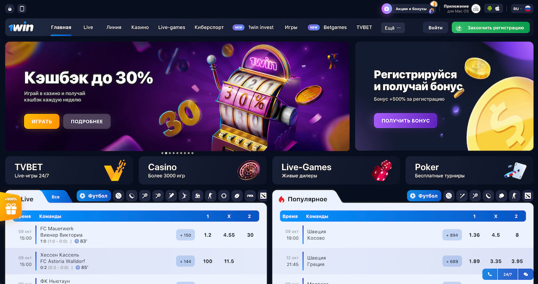 Официальный сайт 1вин — это интернет-платформа, которую делят букмекерская контора и казино. Регистрация на сайте открывает доступ к ставкам на спорт и игровым автоматам в БК.
